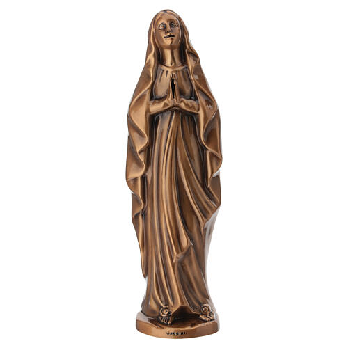 Bronzed statue of Our Lady of Lourdes, full figure, suitable for outdoor display. The statue depicts Our Lady standing, hands joined in prayer and gaze lifted upward; two roses rest at her feet. Designed for placement in outdoor niches and on stone surfaces, the statue is protected by an innovative weather‑resistant coating. It is supplied with compatible fixing pins engineered to secure the statue to the ground. Available sizes: 26.5 x 8 x 6.5 cm, 41 x 12.5 cm and 54 x 16.5 cm. Made in Italy by a historic artistic foundry with a long tradition in bronze casting for monuments, stone decorations and durable devotional objects. Each piece is produced through numerous manual processes, resulting in a unique Made in Italy artifact.