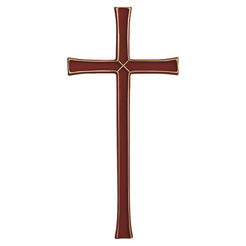 Bronzed Wall Cross with red enamel for outdoor use. Latin bronzed cross with a slight central groove, adorned with red enamel decoration. This wall cross comes with included fixing pins for mounting on walls and graves. Perfect for outdoor display, thanks to an additional protective patina applied. Available in sizes 15x8 cm, 20x10 cm, and 25x12 cm. This wall cross for graves is made in Italy from high-quality materials and undergoes numerous artisanal processes. The historical foundry where it is produced is renowned for crafting durable and refined cemetery and funerary products.