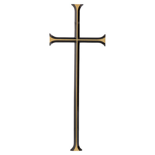 Classic wall-mounted funeral cross in a bronze finish. A funerary cross designed for wall mounting, featuring a vertically oriented profile with linear-shaped arms. The composition presents balanced proportions, uniform surfaces and a bronze treatment appropriate for funerary and tombstone contexts. Manufactured in Italy by workshops specialized in the funerary sector, produced through established production cycles with a protective bronze surface treatment and hand-finishing interventions to re...
