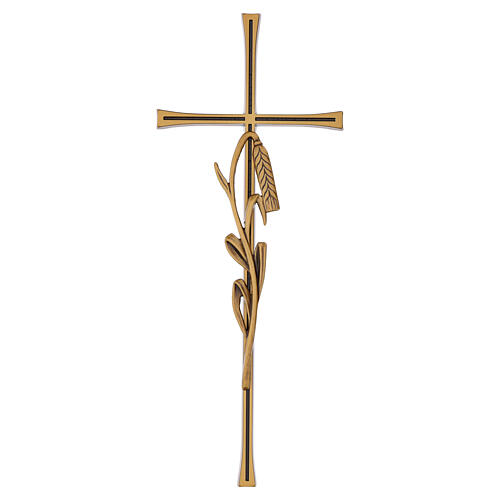 Decorative bronze wall cemetery cross for outdoor use, 40x15 cm. Wall-mounted grave cross made of a metal alloy with a bronze finish. The structure features linear arms with a regular section and a lateral decorative insert with a stylized vegetal motif applied to the vertical shaft, with smooth surfaces and a defined profile. The grave cross is supplied with rear metal pins for direct wall fixing on stone or masonry supports. It is intended for external installation in cemeteries and is designed for stable mounting on headstones, monuments, and commemorative plaques. Produced in Italy at an artistic foundry specialized in bronze casting for funerary symbols and metal artifacts, finished through manual workmanship and traditional processes. The actual dimensions of the cross are 40 x 16 cm.