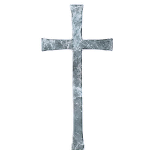 Green marble-effect outdoor wall cross. A wall-mounted cross suitable for outdoor use, protected by a special weather‑resistant patina. This classic Latin cross in brass features an elegant green marble-effect finish with white veining. The grave cross is supplied with the accessories required for installation: the rear includes housings compatible with the supplied fixing pins. Available in sizes 12 x 6.5 cm, 15 x 8 cm and 20 x 10 cm. Made in Italy by a historic artistic foundry renowned for its excellence in bronze casting for monuments, stone decorations and durable liturgical objects. Each piece is the result of numerous manual processes that produce a unique Made in Italy artifact.