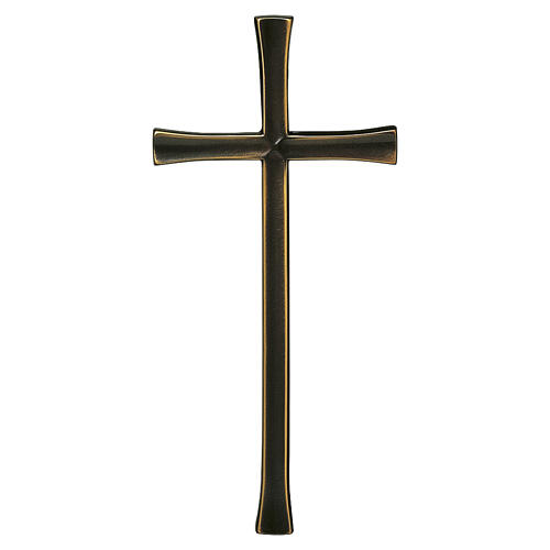 Matte black enamel bronze cross for outdoor use. Simple Latin cross, with a slight central groove, perfect for decorating indoor and outdoor spaces. This bronze cross for graves and memorials is colored with matte black enamel. Ideal as a decorative accessory for gravestones. Available in two sizes: 15x8 and 20x10 cm. Suitable for outdoor use. This wall cross comes with mounting pins included for application on walls and gravestones. Crafted in Italy, using high-quality materials, this item undergoes numerous artisanal processes. The historic foundry where it is produced is renowned for creating enduring and refined funerary and cemetery products.
