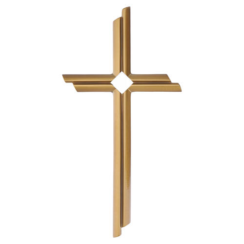 Modern bronze-finished outdoor wall cross with a square pierced central motif. Designed for exterior use, the cross is protected by a special patina that shields it from the elements. The cemetery cross is supplied with the necessary mounting fittings: the back features sockets compatible with the fixing pins provided. Available in sizes 50 x 25.5 x 2.5 cm and 65 x 35 cm.