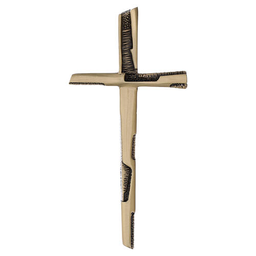 Modern bronze lost-wax outdoor cemetery cross, 14.5 cm. A contemporary-design bronze cross crafted using the ancient lost-wax casting technique, which produces unique, one‑of‑a‑kind pieces by creating an initial wax model that is destroyed during the casting process. This outdoor crucifix measures 14.5 x 7 cm and is supplied with pins for wall mounting. Suitable for outdoor display, ideal for adorning plaques, monuments and headstones. Made in Italy by a historic artistic foundry with a long tradition of excellence in bronze casting for monuments, stone decorations and durable objects. Each bronze wall cross is the result of numerous manual processes that bring forth a unique Made in Italy artifact.