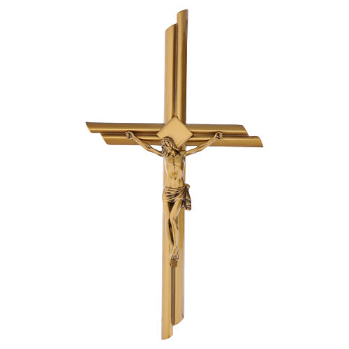 Modern bronze outdoor grave cross crucifix. Modern outdoor crucifix with a classic-style body of Christ. Wall cross suitable for outdoor use and protected by a special patina to withstand the elements. This cemetery cross comes with mounting accessories: on the back are slots compatible with the supplied fixing pins. The cross is available in sizes 65x35 cm and 75x35 cm. Made in Italy by a historic artistic foundry. This all-Italian foundry has a long history of excellence in bronze casting for monuments, stone decorations, and objects designed to last. Each piece is the result of numerous manual processes that create a unique, Made in Italy artifact.