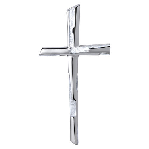 Modern stainless steel cross for graves with white enamels for outdoor use. Crafted in stainless steel, this modern cross features a sophisticated design with polished steel and white enameled matte parts. Resistant to the elements, this outdoor cross is ideal for decorating plaques, tombstones, and niches. Available in sizes 14.5x7 and 19.5x9.5 cm. Made in Italy with high-quality materials using traditional craftsmanship. Created in a renowned foundry known for producing durable and refined artistic monuments. This cross is made using the prestigious lost wax technique: a wax model is crafted for each piece, sacrificed to create the mold, resulting in unique detailed quality.