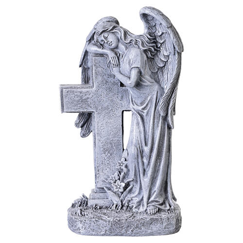 Outdoor angel statue with cross in antique stone-effect resin, 30 cm