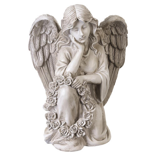 Decorative outdoor resin figure depicting a kneeling angel holding a floral garland. The light stone-effect finish replicates natural materials while being painted with colors resistant to sun and rain, making it ideal for outdoor display. Suitable for headstones, pathways, graves or small commemorative spaces. Size: 28x22x19 cm.