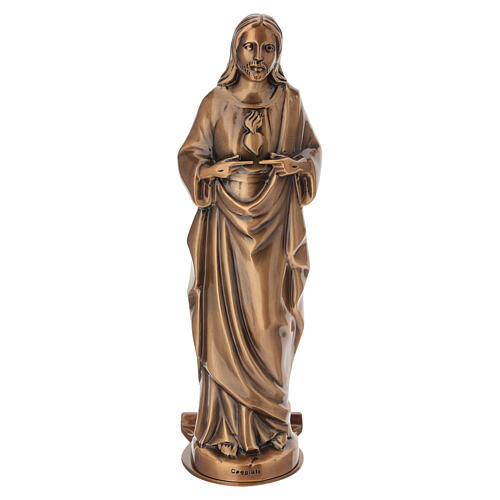 Three-dimensional bronzed statue of the Sacred Heart of Jesus, 28 cm high. The Jesus statue is mounted on a shelf prepared for wall fixing and is suitable for outdoor display in niches, on memorial plaques and on stone surfaces, protected by an innovative weather‑resistant coating. It is delivered with compatible fixing pins engineered to support the weight: to install, drill the plaque at the fixing points, insert the pins and secure them behind the plaque with the supplied nuts. Overall dimensions: 28 x 8 x 8.5 cm. Made in Italy by a historic artistic foundry with a long tradition in bronze casting for monuments and durable stone decorations. Each Jesus grave plaque is produced through numerous manual processes, resulting in a unique Made‑in‑Italy object.