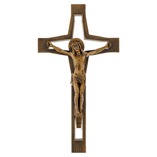 Wall cross with integrated figure of Christ, bronze finish, 40 cm. Designed for memorial and religious applications on vertical surfaces, the cross has a linear profile with proportioned arms and a central Christ relief, suitable for funerary and memorial contexts. Manufactured in Italy by an artistic foundry specialized in the funerary sector, using established production processes with protective treatments and manual finishing to ensure uniform surfaces and long-term durability. Supplied comp...