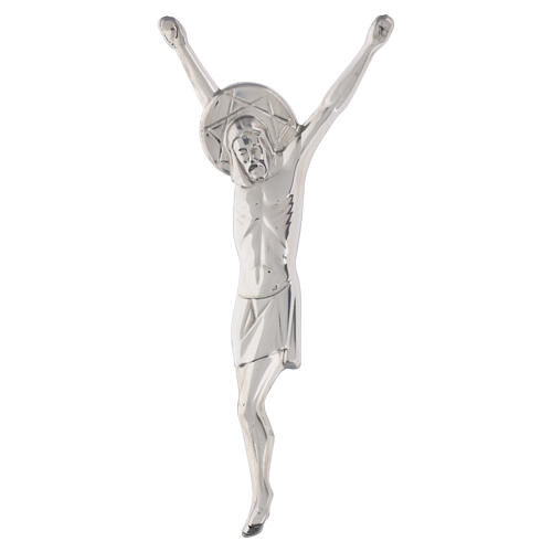 Wall cross with integrated figure of Christ in polished steel. Designed for commemorative and religious applications on vertical surfaces, the piece reproduces a Latin cross with a vertical shaft and a central Christ relief, its formal configuration suitable for funerary and memorial contexts. Manufactured in Italy by an artistic foundry specialized in the funerary sector, produced through established production cycles with protective treatments and manual finishing to ensure uniform surfaces and long-term durability. Available in multiple size variants; actual dimensions: 11 x 5 cm, 20 x 9 cm, 27 x 12 cm.