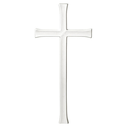 White Wall Latin Cross for Outdoors. Simple yet elegant wall Latin cross for graves and memorials, made of white enameled bronze alloy. Designed for outdoor wall mounting, it comes with pre-drilled holes at the back and includes a pair of compatible mounting pins. Available in various sizes: 12x6.5 cm, 15x8 cm, 20x10 cm, 25x12 cm, and 30x14 cm. Crafted in Italy using high-quality materials through several artisanal techniques. Produced in a renowned historical foundry known for creating durable and refined cemetery and funerary products.