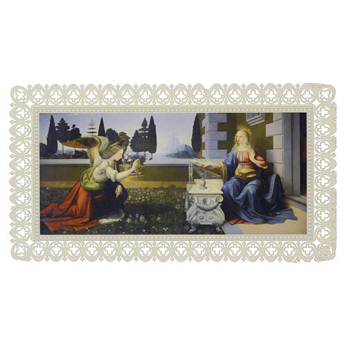 Annunciation holy card depicting a Renaissance-style scene, 12x21 cm. The image shows the Annunciation with Archangel Gabriel and the Virgin Mary engaged in dialogue, set within an architectural interior with a landscape in the background. Printed on fine cotton-fiber paper (12x21 cm) and finished with a rectangular, finely pierced lace-edged border. The composition follows the formal arrangement typical of Italian Renaissance sacred art. Artisan-made in Italy using selected materials and specia...