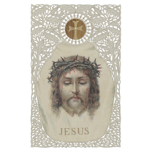 Holy card of Jesus crowned with thorns, 12x7 cm. This holy card depicts the face of Jesus crowned with thorns, bearing an expression of peaceful suffering. Printed on cotton-fiber paper with a finely worked lace border, it is a devotional item designed for personal meditation and spiritual recollection. Handmade in Italy, it measures 12x7 cm and is delivered in a protective sleeve. A tangible sign of faith and mercy.