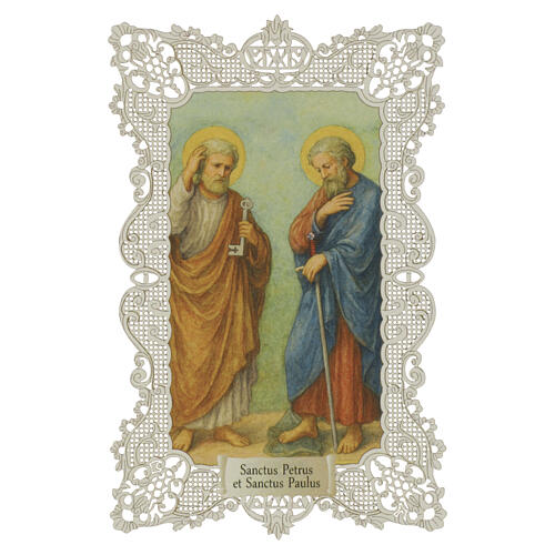 Catholic holy card depicting Saints Peter and Paul with apostolic symbols, size 12x7 cm. The image shows the two saints standing side by side with their traditional attributes: Saint Peter holds the keys and Saint Paul the sword, symbols of their apostolic mission and martyrdom. The print is on fine paper (12x7 cm) and framed by a rectangular lace-like border with pierced floral and geometric motifs. Rendered in a classical pictorial style with gilded halos and warm, harmonious vestments, it ref...