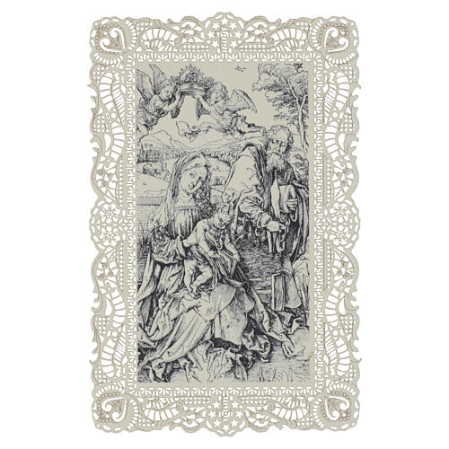 Holy card of the Holy Family in woodcut style, 12x7 cm. Black-and-white sacred image depicting the Holy Family with two flying angels, executed in a woodcut style. Printed on 12x7 cm cotton-fiber paper and framed by a dense, pierced lace-like border. The graphic composition recalls early Renaissance engravings, with marked attention to line and movement. Made in Italy using artisanal techniques and quality materials. It is delivered in a transparent sleeve to protect and preserve the finish.