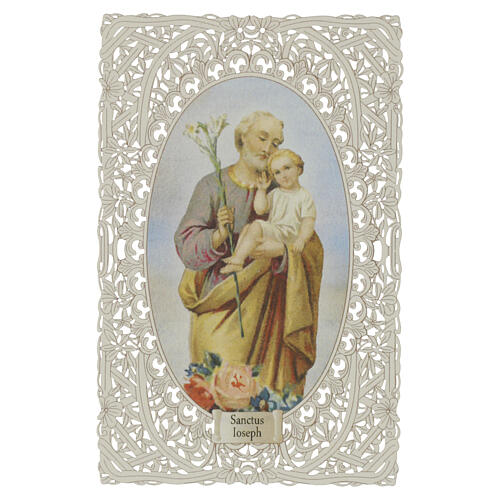 Holy card of Saint Joseph with Child Jesus and lily 12x7 cm. This Catholic holy card depicts Saint Joseph holding the Child Jesus and a white lily, symbolizing purity and spiritual fatherhood. Printed on fine paper in a 12x7 cm format, it features a finely pierced oval lace-like frame with floral motifs. The composition is sweet and traditional, with floral details at the base. Italian handcrafted product made with selected materials and careful printing techniques. Packaged in a clear sleeve for optimal preservation.