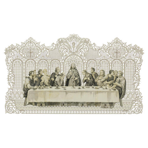 Embossed holy card of the Last Supper with a Gothic pierced frame, measuring 12x21 cm. The image depicts the Last Supper of Jesus with the twelve Apostles seated around the table, in the traditional representation of the institution of the Eucharist. The print is made on fine paper and embellished with a Gothic-style pierced frame featuring lace-like detailing. The subject is rendered in neutral tones with a symmetrical composition, evocative of classical religious icons. Artisan product entirely made in Italy using selected materials and refined decorative workmanship. It is delivered in a transparent sleeve for protection and preservation.