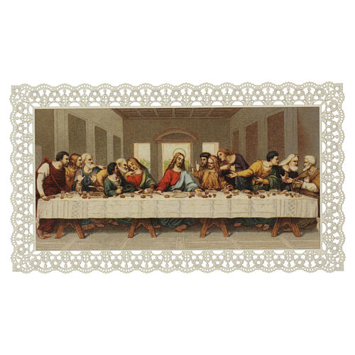 Last Supper holy card with Leonardesque scene 12x21 cm, lace border