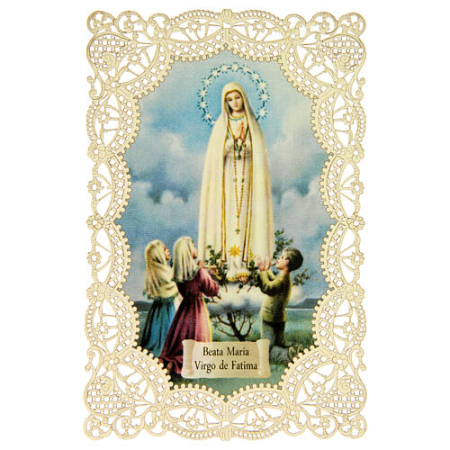 Our Lady of Fatima lace-decorated Holy Card,11x7 cm. Made of high-quality cotton fiber paper, this Catholic holy card features a detailed lace decoration reminiscent of ancient styles, enhancing the image with intricate craftsmanship. A 100% made in Italy product, blending advanced technologies with artisanal workmanship. Ideal for devotion, spiritual aid, and prayer support, this holy card is a keepsake item and comes in a protective sleeve. Explore this exquisite collection available on Holyart.