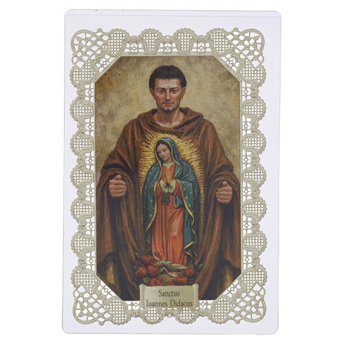 Saint John Diego Holy Card with delicate lace decoration, measuring approximately 11x7 cm. Crafted from high-quality cotton fiber paper, this Catholic holy card showcases a refined lace pattern reminiscent of ancient traditional cards, crafted with meticulous attention to detail. A 100% Italian creation, blending state-of-the-art technologies and skilled artisanal craftsmanship. This holy card is a cherished item for devotion, to be kept as a memory, a source of spiritual guidance in prayer, enclosed in a protective sleeve.