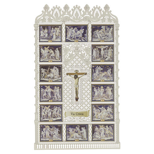 Stations of the Cross Holy Card with 14 stations 12x21 cm. This image gathers the 14 Stations of the Cross, each depicted in miniature around a central cross, following the liturgical sequence of the Passion of Christ. Printed on high-quality paper (12x21 cm) and framed by a finely pierced lace border, it is presented in a vertical format with a narrative layout. Rendered in a compact iconographic style, monochrome and in relief, it is suited for meditative, sequential contemplation.