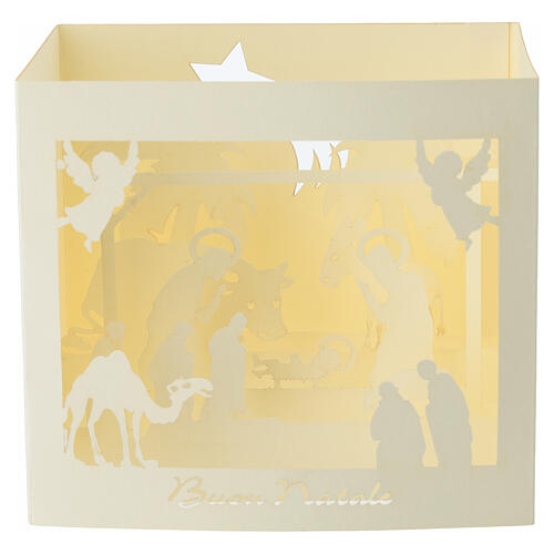 White 3D pop-up Nativity Christmas card. Christmas card featuring a complete depiction of the Nativity scene. Made using laser-cutting technique; when opened the design unfolds into a 3D model. Includes a greeting insert and an envelope. Opened dimensions: 10.5 x 11.5 x 9.5 cm.