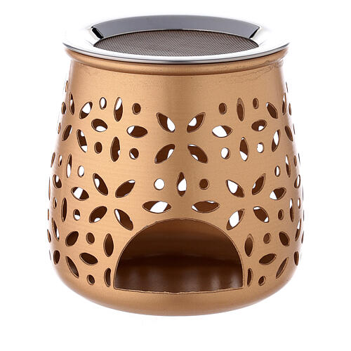 Perforated incense burner in golden aluminium 4.3 inches. Incense burner for tea light candle and burner on the upper side, made in aluminium painted in metallic gold and decorated with a stylized perforated flower pattern.