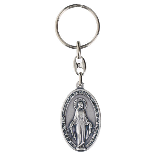Catholic keychain with an oval medallion (4.5 x 2.5 cm) depicting the Miraculous Madonna on the front and a cross with Marian monogram, hearts and stars on the back, made of silver-plated zamak. The medallion has an oval profile with well-defined raised relief on both sides, an inscription along the edge and sandblasted surfaces; it is attached to the ring by a short chain. Made in Italy in die-cast zamak with a silver finish, entirely worked in raised relief without enamels or inserts. The medallion measures 4.5x2.5 cm; the total height of the keychain, including chain and ring, is 8 cm.