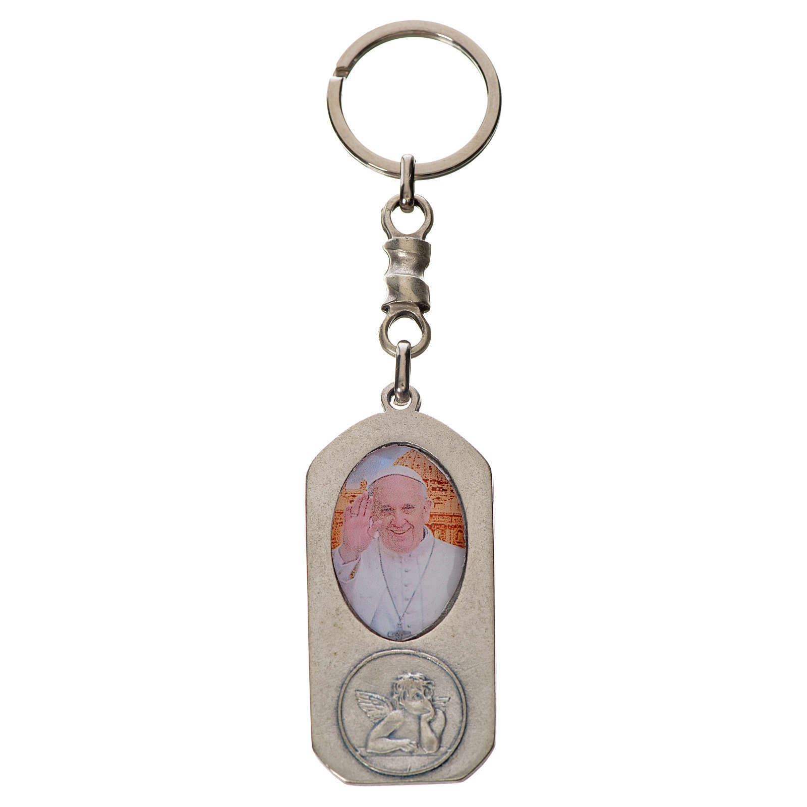 Keyring in zamak with Pope Francis image measuring 5.2x2.5 cm.