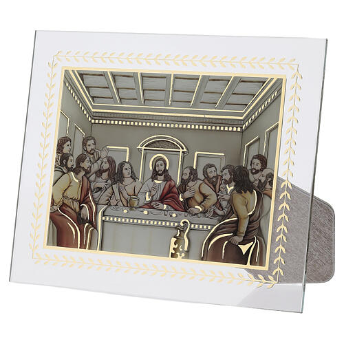 Last Supper Valenti glass frame 18x20 cm. Sacred picture with a high-definition print on a glass panel measuring 17x21 cm. Depicts the Last Supper in a horizontal composition, rendered in warm tones with gilded details on the halos and an engraved decorative border. Produced by Valenti Argenti, an Italian silverware company, with workmanship attentive to the rendering of figures and ornamental elements. The frame features a rear support for tabletop display and is supplied in a branded gift box for protection and presentation. Made in Italy.