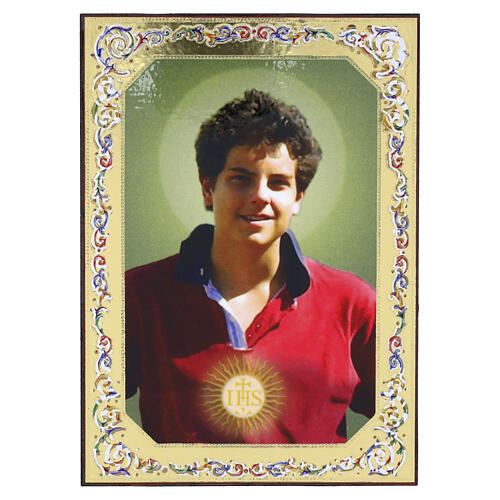 Floral wooden icon of Saint Carlo Acutis, 15x10 cm. Shaped hardwood Catholic icon featuring an image of Saint Carlo Acutis at the center, framed by printed floral motifs and a gilded border bearing the inscription 'Saint Carlo Acutis, pray for us' in Italian. The front surface features high-definition color printing with integrated graphic details. Solid wood construction with an arched profile and a flat base for stability. Italian-made product crafted from carefully selected materials.