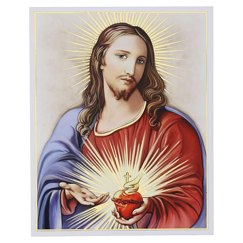Wooden Sacred Heart of Jesus Picture, 25x20 cm Valenti. Dedicated to the Sacred Heart of Jesus, this picture is made in Italy by Valenti Argenti. The high-definition image, printed on a wooden support, provides a sharp and bright depiction, enhanced by exquisite golden details in slight relief that can be felt to the touch. Delicate golden touches frame the figure and enhance significant details, such as the folds of the robe, the crown of thorns, and the heart. The picture can be placed on a fl...
