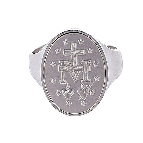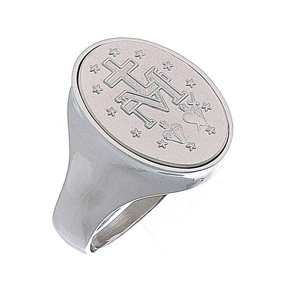 Miraculous medal ring in sterling silver. Adjustable ring depicting the beck of the Miraculous medal.