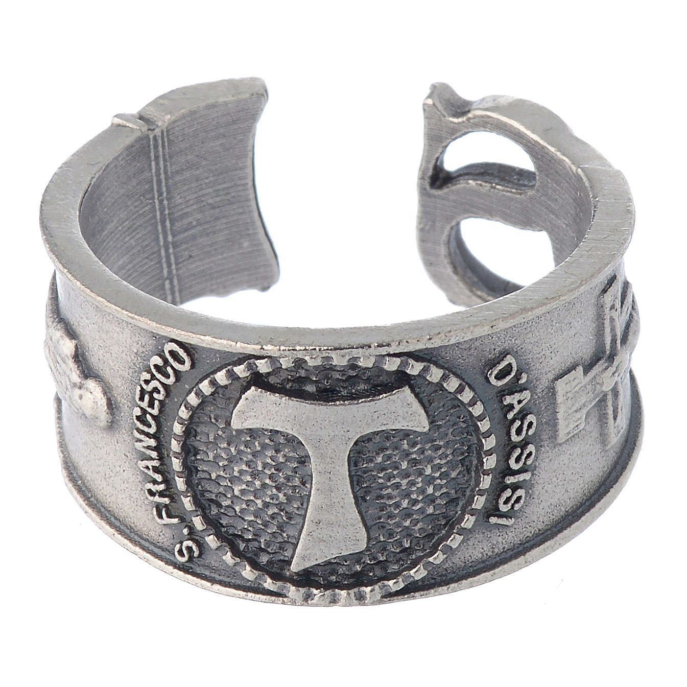Zamak ring with Saint Francis image. Ring with antique silver finishing and image of the Saint and a Tau cross, available in different sizes.