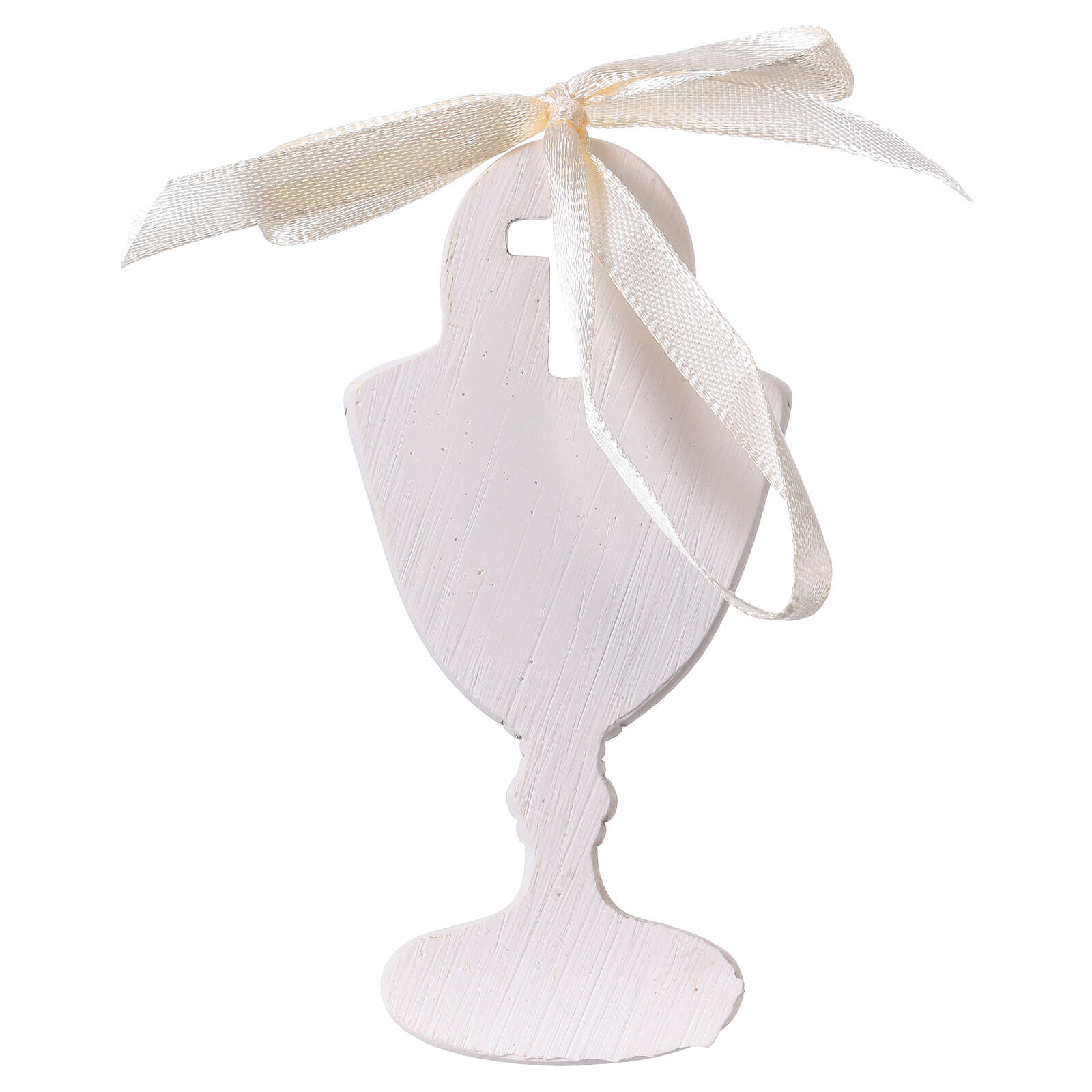 Chalice wall ornament with girl 3.5 in resin. Chalice shaped wall ornament made of resin with embossed image of a girl in prayer, suitable as Holy Communion favor.Resin, compared to pvc, is a more delicat and light material, which offers a better definition of lines and details.