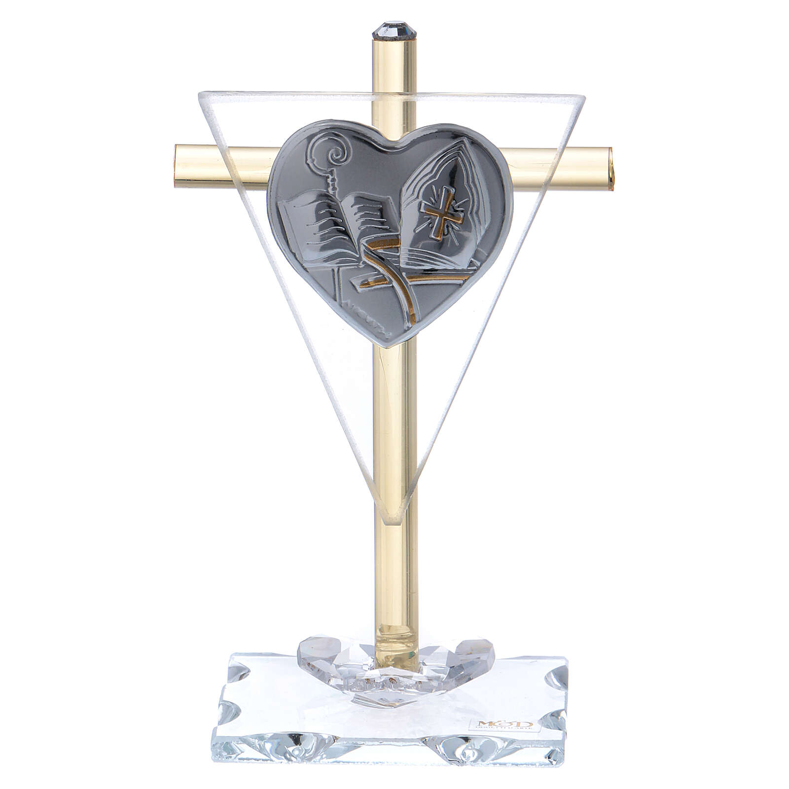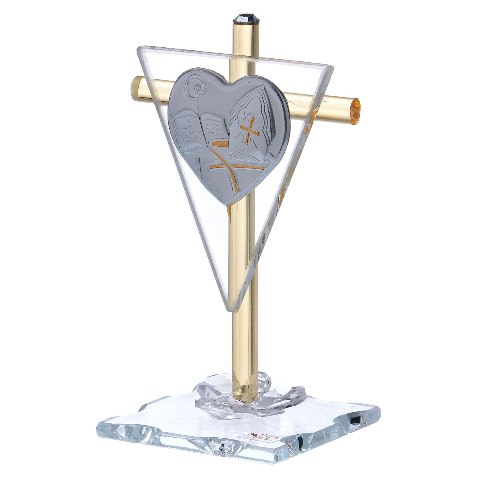 Confirmation souvenir Cross crystal and glass 3.9x2.4 in. Cross of Murano glass decorated with heart shaped silver foil representing Eucharist symbols, on glass triangle.