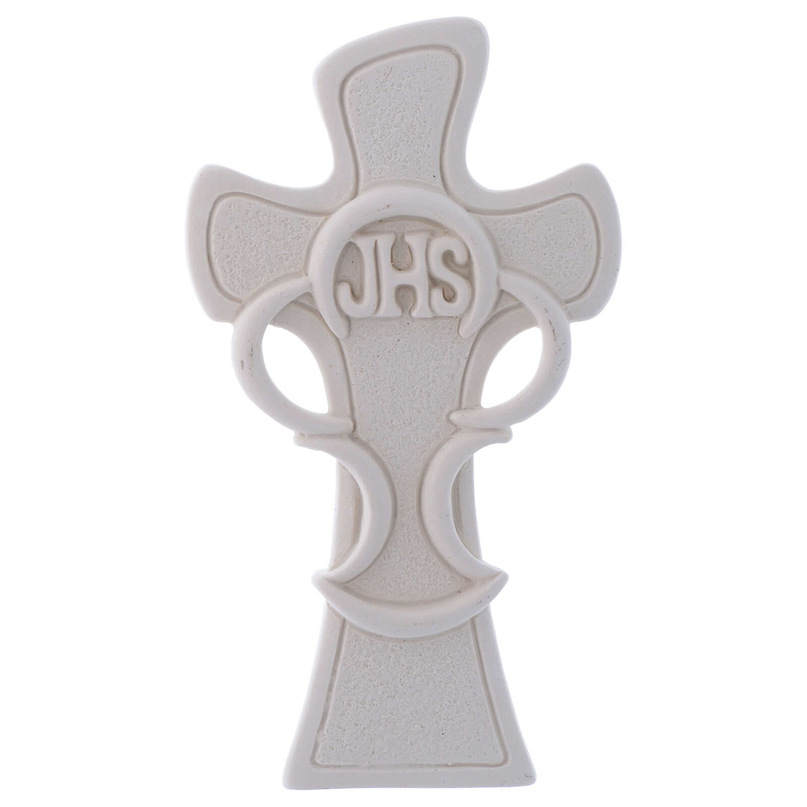 Souvenir Cross Eucharist symbol h 3.7 in. Cross shaped favor with embossed image of Eucharist symbol, made of white marble dust.