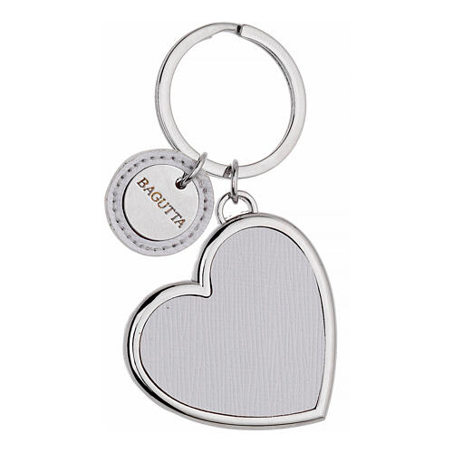 White faux leather heart keychain, Bagutta. Heart-shaped pendant with white faux leather insert, 4.5 cm high and 4.5 cm wide. A small round charm with a plate engraved with the 'Bagutta' logo completes the piece, a sign of authenticity and refinement. The keyring is metal with a 3 cm diameter. Bagutta, founded in 2000 in Bergamo, is a dynamic company specializing in gifts, bomboniere, home accessories and stationery, with a solid presence in Italy and Europe.