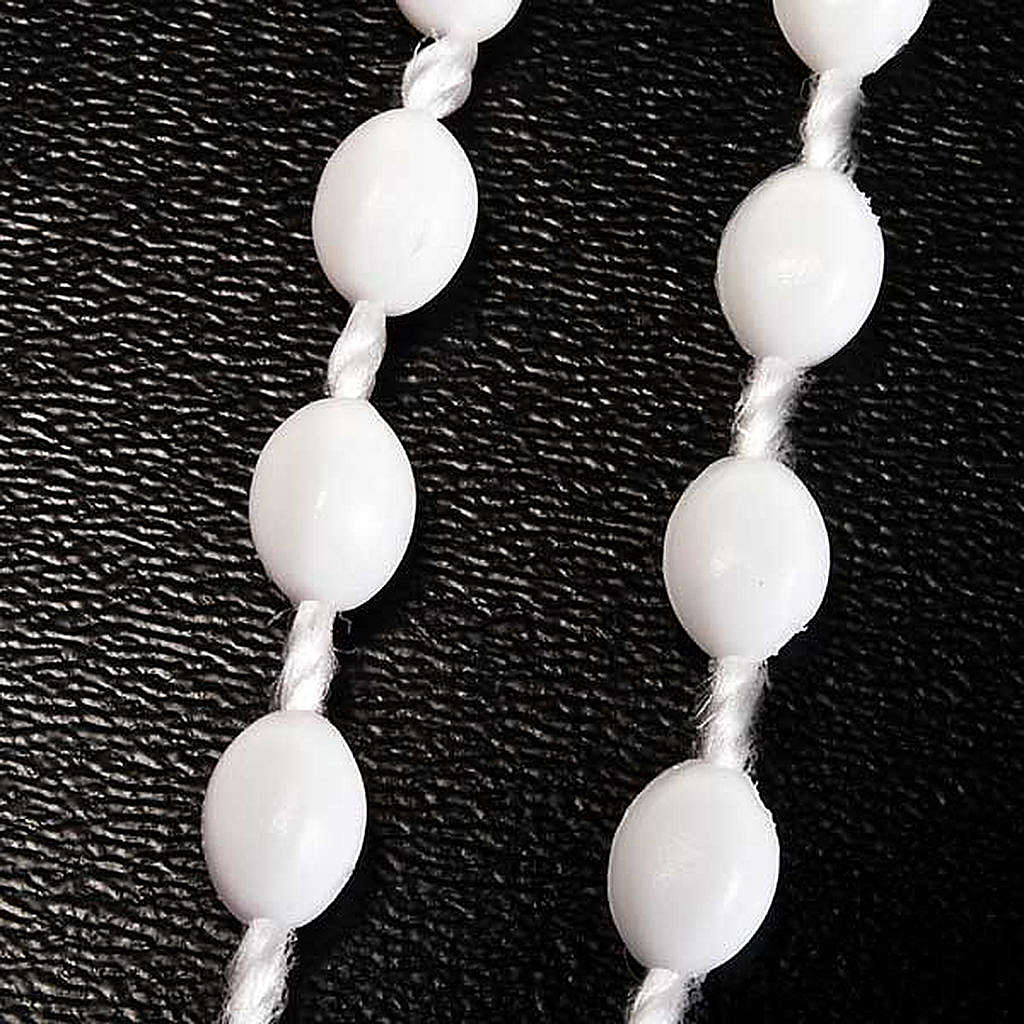 Plastic white rosary. The oval center of this rosary can be opened to easily wear the rosary.