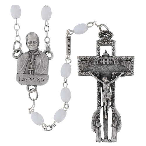 Ghirelli rosary from the glass collection, dedicated to Pope Leo XIV. Glass rosary with oval beads 7x5 mm mounted on a silver-plated metal chain, with a total circumference of 57 cm. The glass beads have a smooth milk-white finish and are linked by metal elements. The centerpiece depicts Pope Leo XIV on the front and, on the reverse, a reference to the Gospel moment of Christ entrusting the Church to Peter. Produced by the Ghirelli family, an Italian company specialized in the manufacture and as...