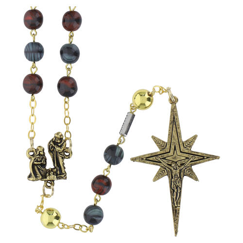 Ghirelli rosary for Christmas time completed with Bohemia glass beads. The center piece depicts the birth of Infant Jesus, while the crucifix depicts the Body of Christ.