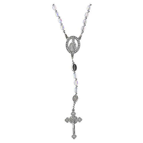Miraculous Madonna rosary with 5 mm white, crystal‑effect barrel‑cut glass beads mounted on a metal wire structure. Faceted glass elements with an AB finish are set along the metal wire with oval figurated connectors and an adjustable extender. The wire construction is combined with a pater bearing the Miraculous Medal and a metal cross with contoured arms. Overall circumference: 46 cm; metal cross: 30 x 15 mm.