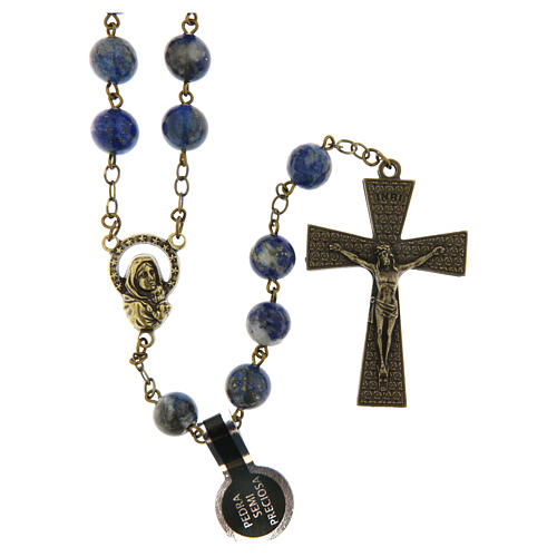 Bronzed Lapis Lazuli Rosary, 8mm. The wearable rosary measures 74 cm in circumference, featuring smooth lapis lazuli stone beads with an 8 mm diameter. Both the centerpiece and the cross are bronze with golden highlights. The cross stands 4.2 cm tall and is 3 cm wide. Weighs 108 grams.