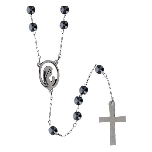 Silver-plated steel rosary with 3 mm hematite beads. Rosary necklace with an hematite and silver-colored steel closure, featuring an overall length of 61 cm. The 3 mm beads offer a refined and delicate design. The centerpiece medal depicts the Virgin with hands clasped in prayer, while the final cross, 2.1 cm high and 1.3 cm wide, completes the piece.