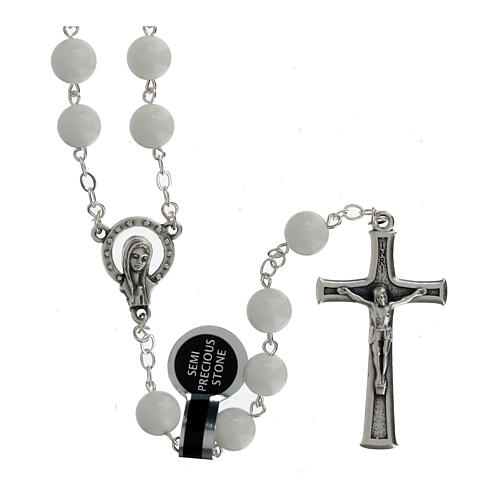 Silver rosary with 5 mm Tridacna beads. The rosary beads, measuring 72 cm in circumference, features a silver cross measuring 4 cm in length and 2.5 cm in width. The decade beads are made of Tridacna stone beads and alternate with 6 mm Tridacna paters. The silver centerpiece medal, measuring 1.6 x 0.9 cm, depicts the Madonna in prayer on both sides, adding profound spiritual significance to the accessory. Rosary weight: 77 g.