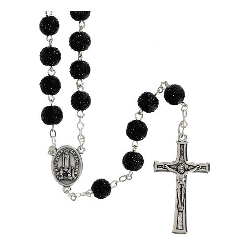Black Plastic Rosary with 5 mm Rhinestones. It features rough 5 mm black beads adorned with black rhinestones. One side of the centerpiece depicts Our Lady of Fatima, while the other side displays the Holy Spirit dove, both silver-plated. The cross measures 4 cm in height and 2.5 cm in width. Weighs 52 grams.