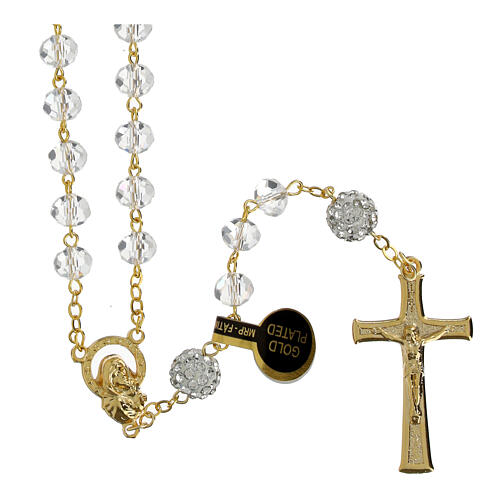 Golden rosary with transparent beads, 5 mm. The rosary, measuring 72 cm in circumference, features a 4.5 cm long and 3 cm wide golden cross. The decades, made of transparent beads with prism cut, alternate with 6 mm diameter white pater beads adorned with sparkling white zircons for enhanced radiance. The golden crucifix, measuring 1.7 x 1 cm, depicts the Madonna in prayer on both sides, infusing the accessory with profound spiritual significance. Rosary weight: 77 g.
