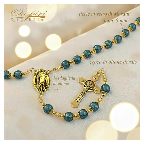 Green and Gold Murano Glass Liturgical Rosary, 8mm. Jewel-quality rosary crafted with 8 mm green Murano glass beads. It features a gold-plated St. Benedict cross at the base and a central medal depicting Our Lady of Fatima. The Our Father and Hail Mary beads are lampwork Murano glass, individually handmade. The Catholic rosary comprises 59 beads arranged in five decades along a 78 cm circumference, making it wearable. The piece is presented in a rigid black presentation box that protects the item while offering the elegance of a gift box. High-quality Made in Italy product with guarantee and quality certificate. Branded SOSPIRI VENEZIA.