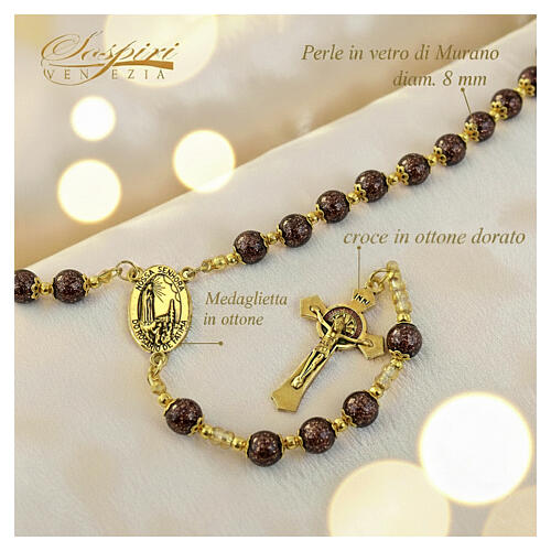 Murano glass rosary with 8 mm black beads and a gold finish. The Catholic rosary is composed of round 8 mm beads made by hand in Venetian glass using Murano lampwork: each bead is individually crafted and shaped. It includes a gold-plated cross with a Saint Benedict medal and an oval centerpiece dedicated to Our Lady of Fatima, both in gold-plated brass. The rosary beads are produced in Italy and is accompanied by a Made in Italy certificate of quality and authenticity signed by SOSPIRI VENEZIA....